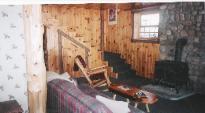 | This roomy log home offers 3 floors of living space, and accommodates 8 to 10 guests. It has four bedrooms (king, double, double, 2 twins), 2 baths, a great room (with cut granite fireplace), family room (with wood stove), dining area, and fully equipped kitchen. Escape or entertain in all four seasons in this well-appointed and traditional log cabin, stocked with bed and bath linens, kitchen utensils and washer and dryer, satellite dish and VCR/DVD. First Floor Layout